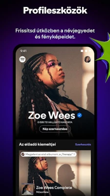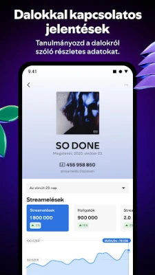 Értsd meg pontosan, kik hallgatják a zenédet, honnan és milyen lelkesedéssel! A Spotify for Artists valós idejű adatokkal szolgál dalaid, playlistjeid és teljes közönséged felől. Kövesd nyomon pillanatról pillanatra, hányan streamelik éppen a számaidat világszerte, és ünnepeld meg az olyan mérföldköveket, mint az új megjelenések sikerei, a playlist-szereplések vagy a növekvő követőszám. Engedd szabadjára kreativitásodat a Canvas funkcióval, mely rövid, ismétlődő vizuálokkal teszi még magával ragadóbbá zenéidet a hallgatók számára.